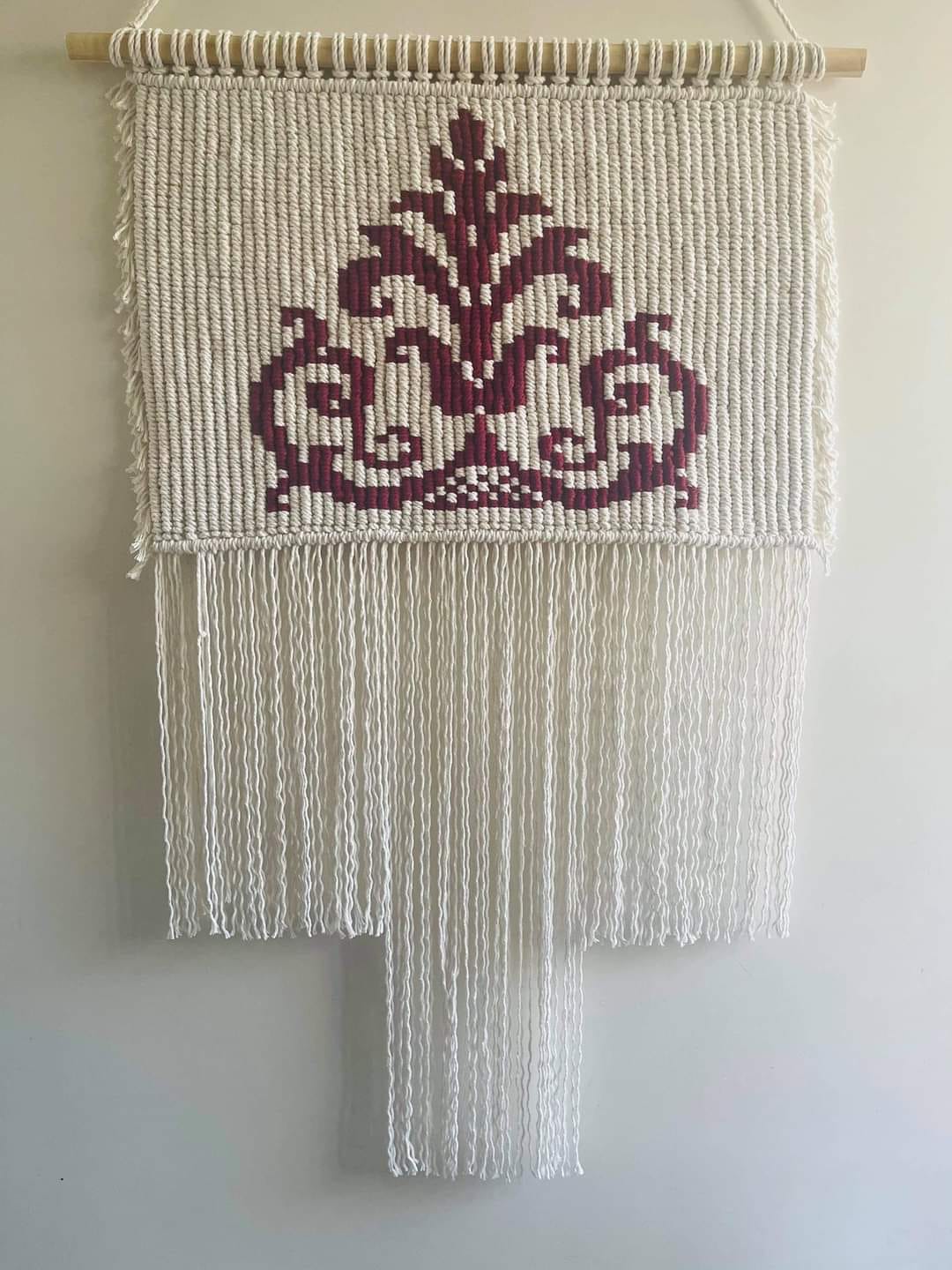 Macramé artisanal bicolore mêlant panneau tissé écru/bordeaux et cascade centrale de franges. En coton naturel, suspendu à une baguette en bois, il apporte une note bohème et contemporaine à vos murs. 60 × 100 cm (barre ≈ 65 cm).